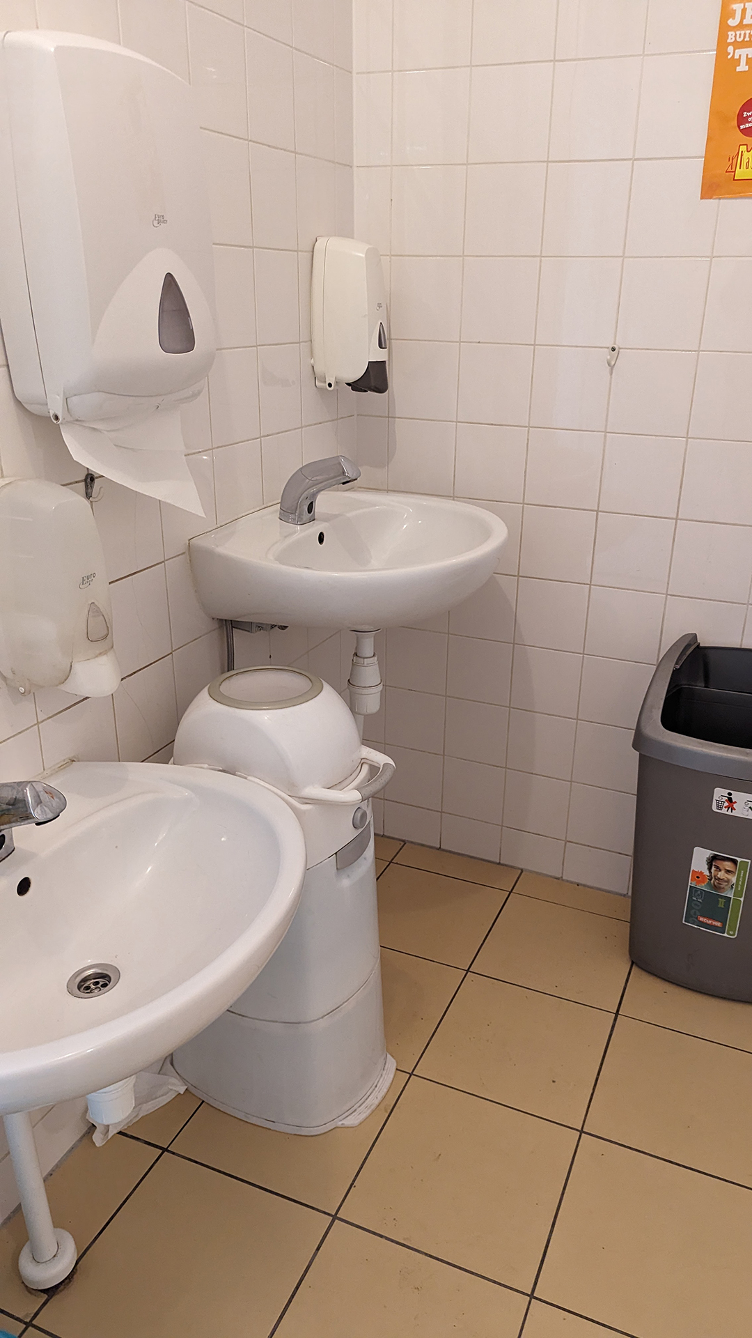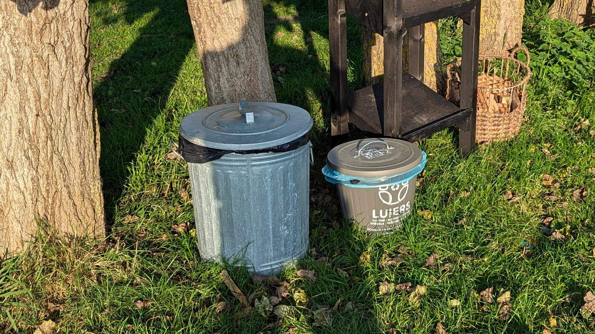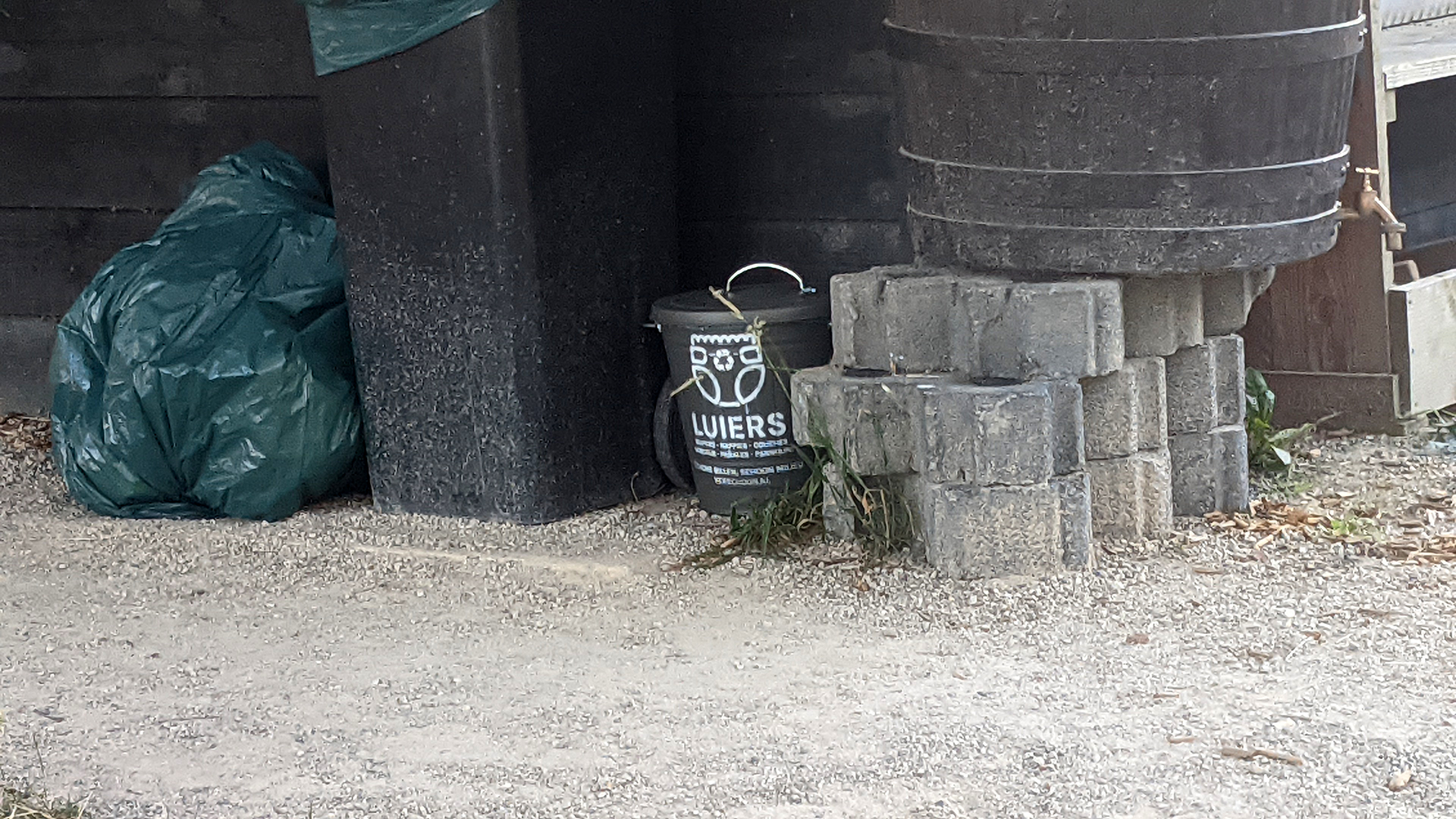 Bij de toiletten in het restaurant en bij de toiletten naast het kippenhok zijn bij de commodes twee DiaperChamp Classic Medium emmers geplaatst.