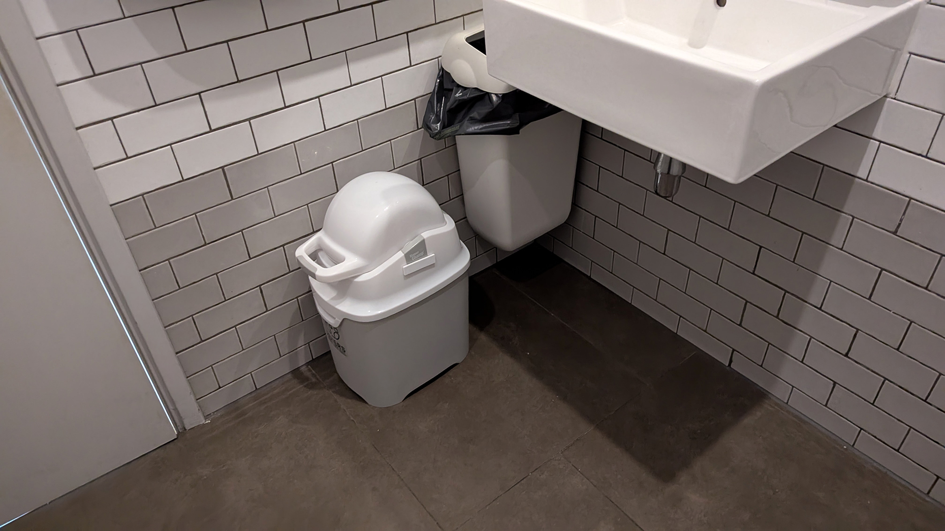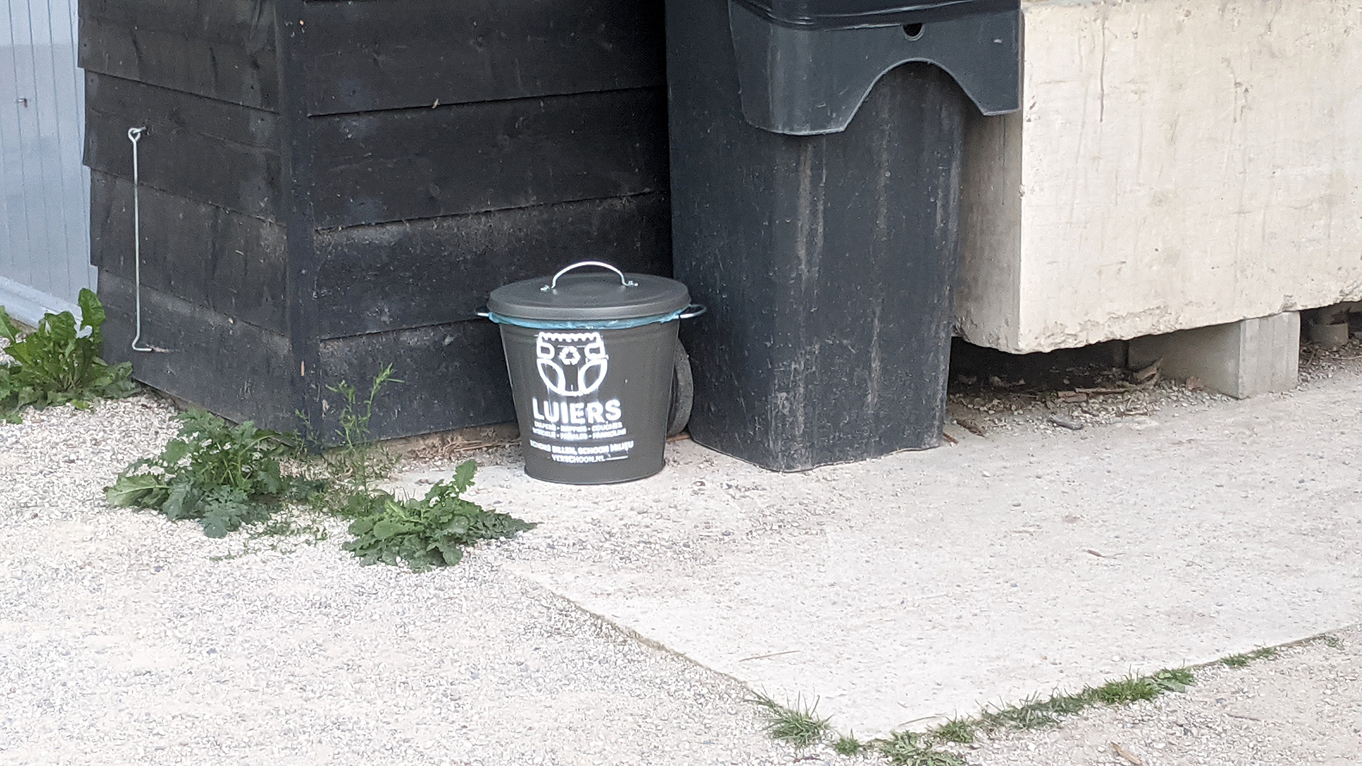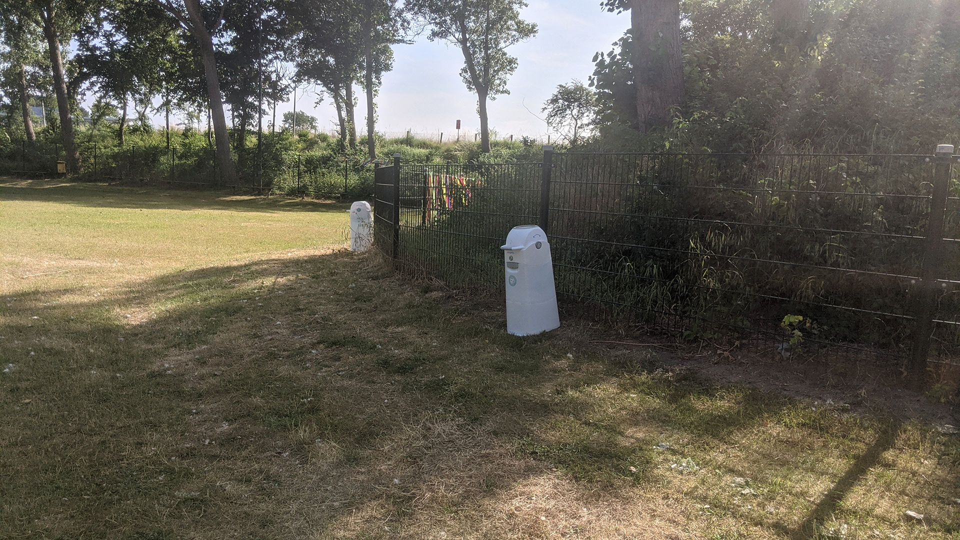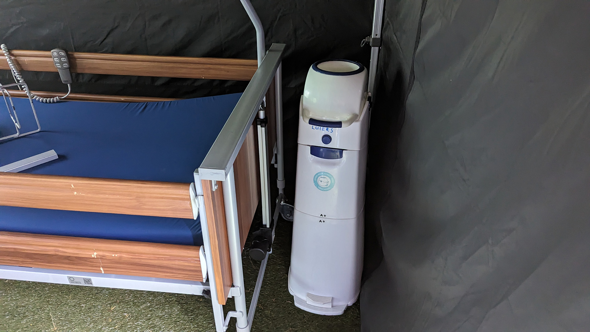 Bij de toiletten in het restaurant en bij de toiletten naast het kippenhok zijn bij de commodes twee DiaperChamp Classic Medium emmers geplaatst.