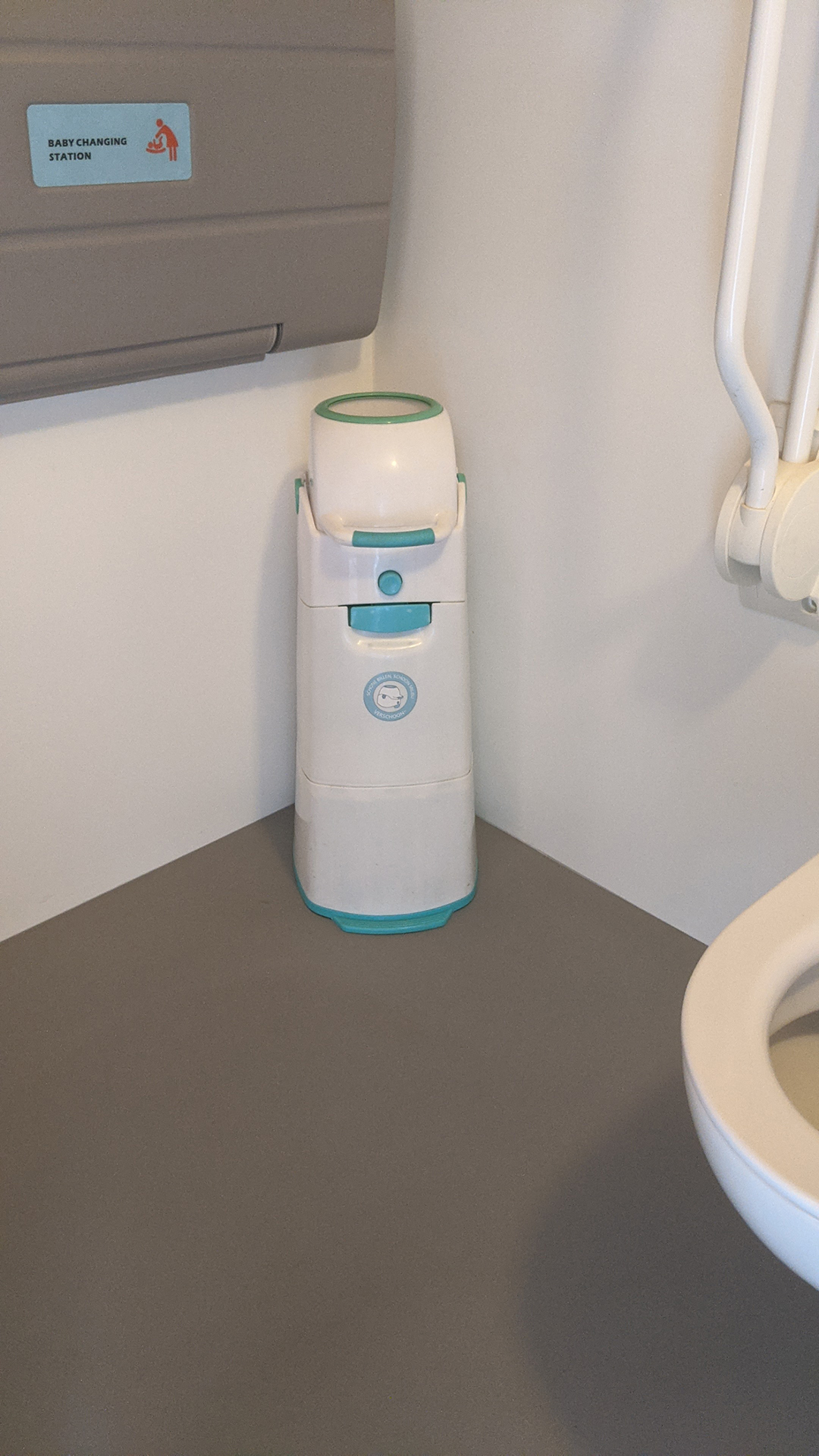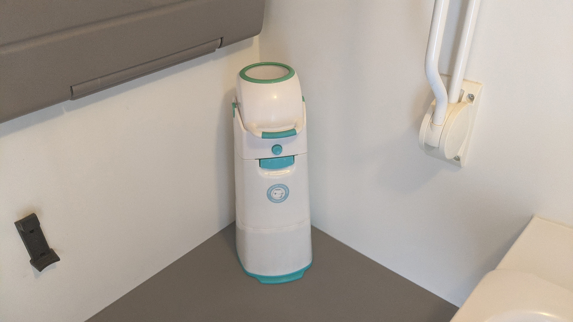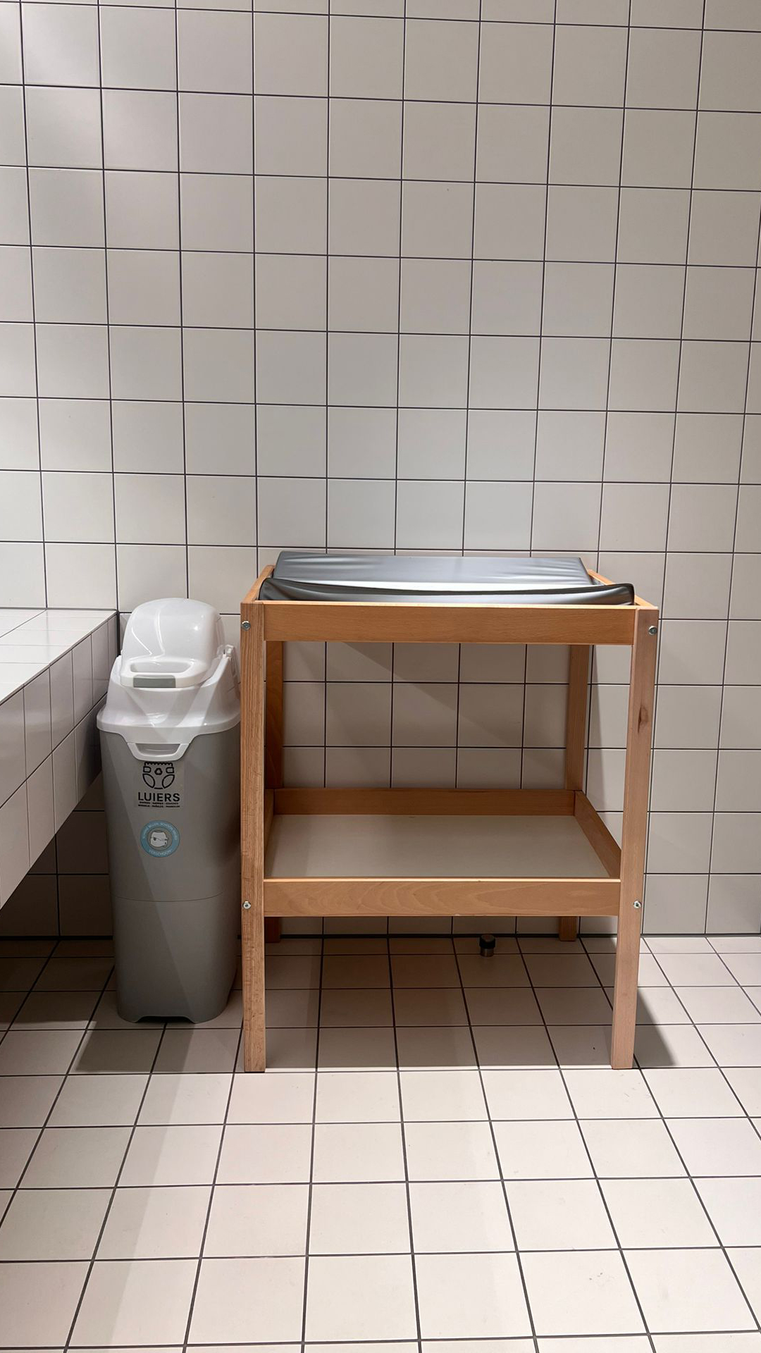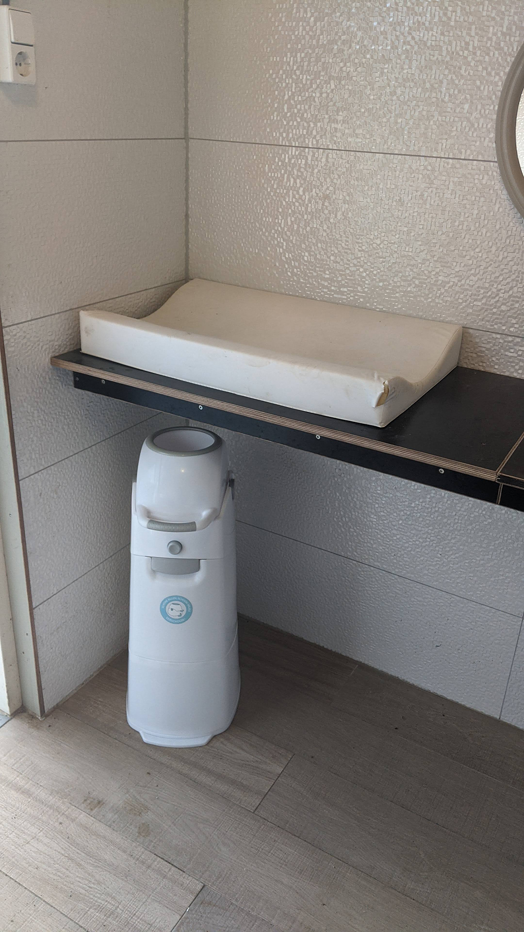 In de toiletten is een uitklapbare commode aanwezig met daarbij een Diaper Champ One Standard luieremmer.