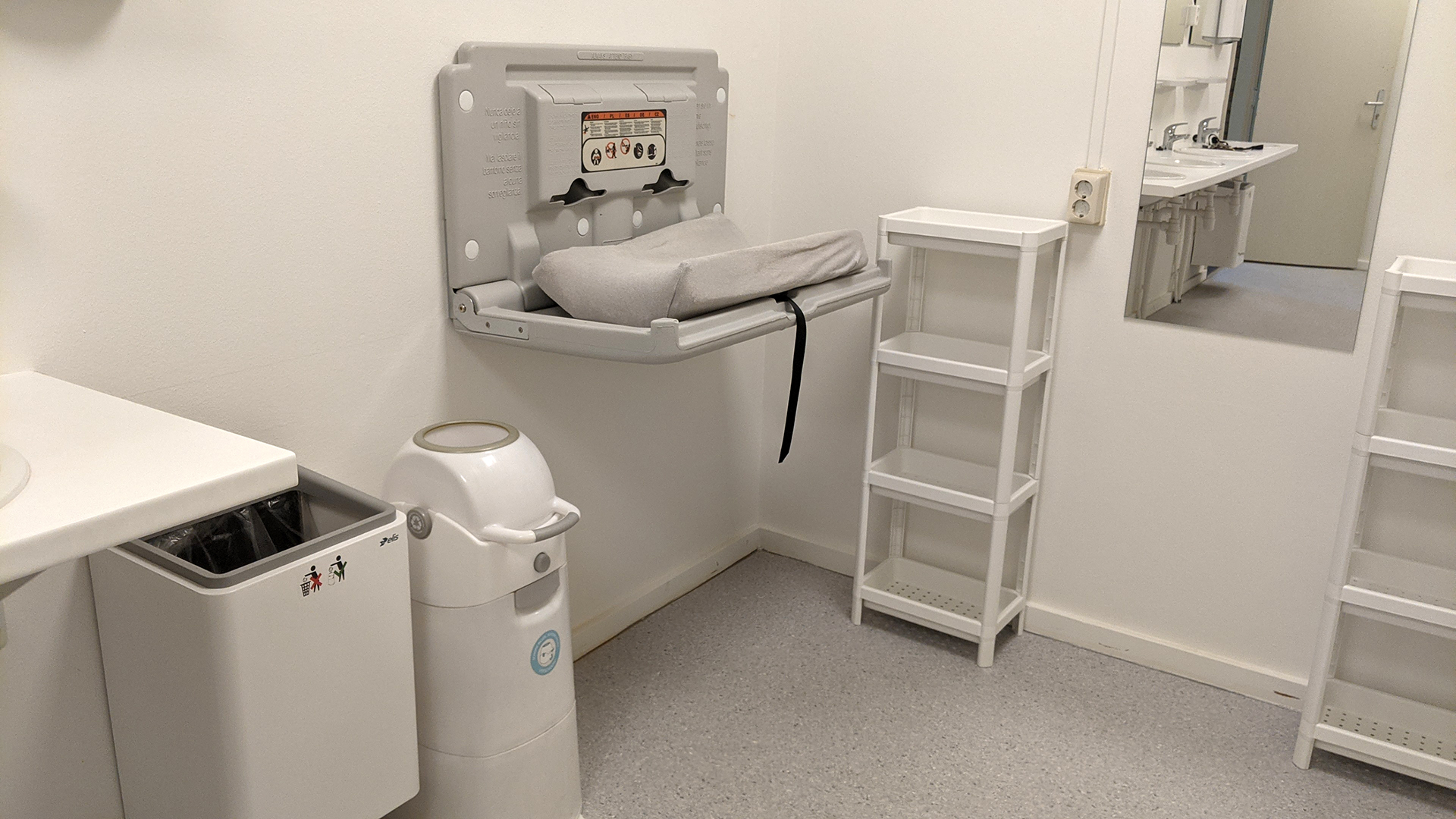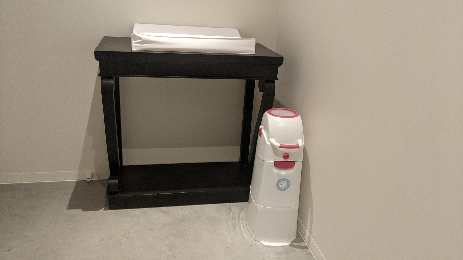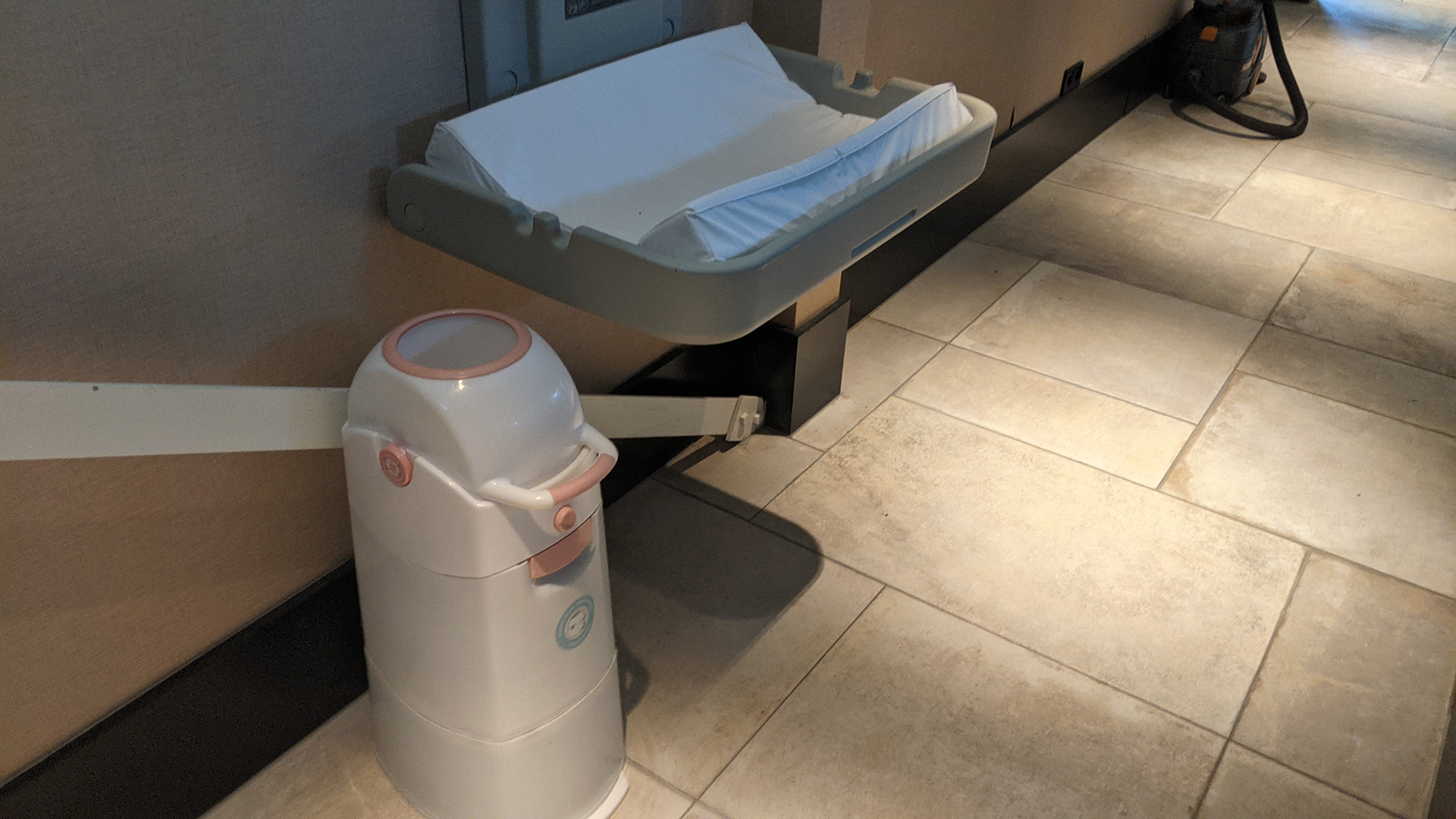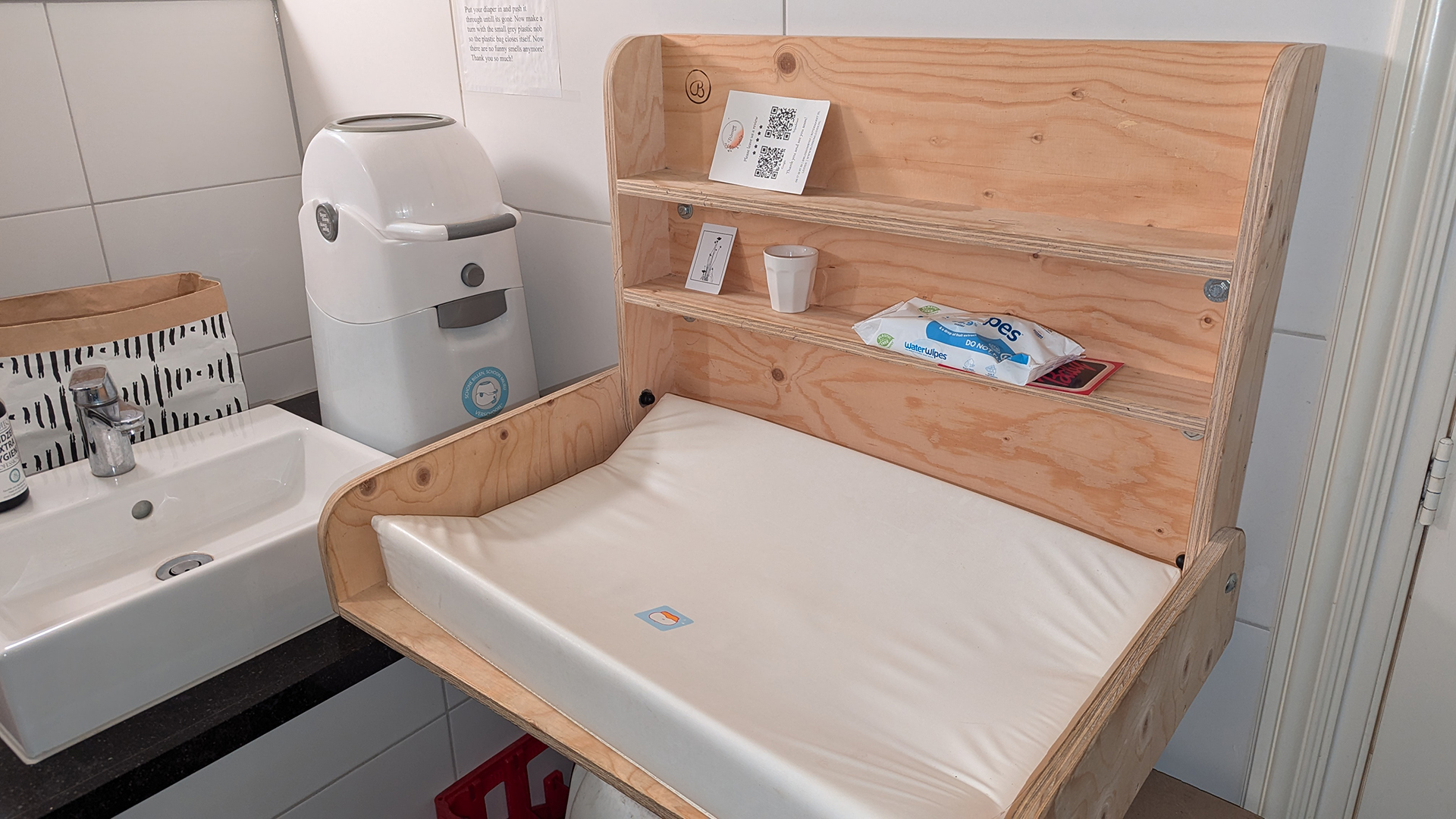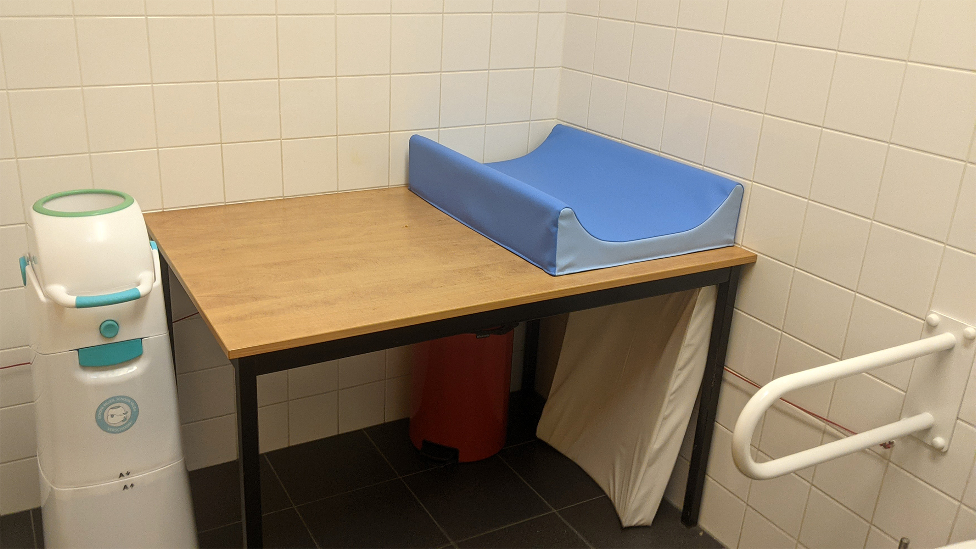 In de toiletten is een uitklapbare commode aanwezig met daarbij een Diaper Champ One Standard luieremmer.
