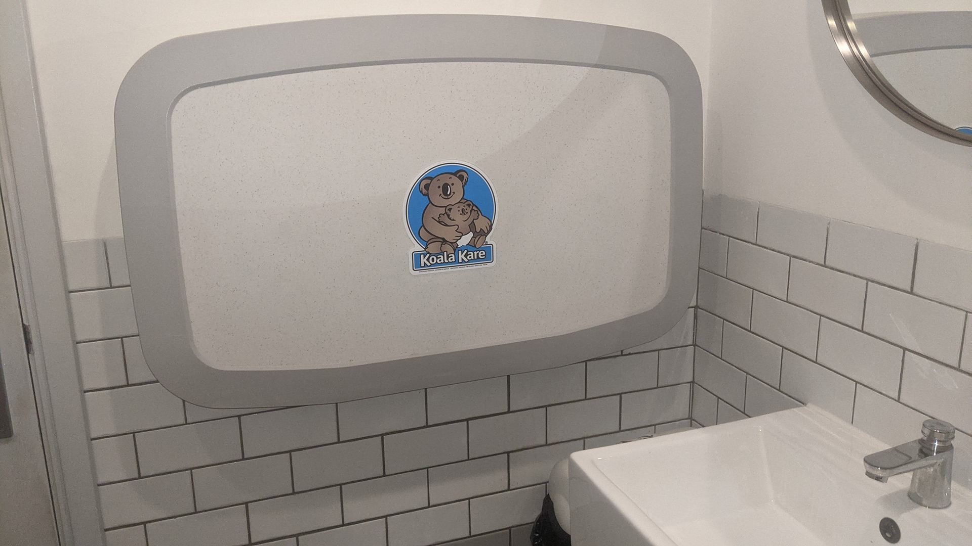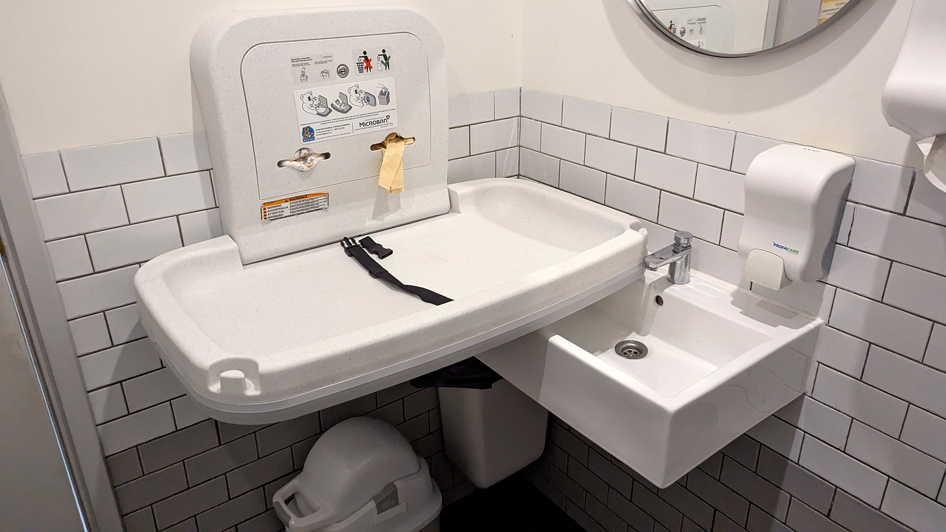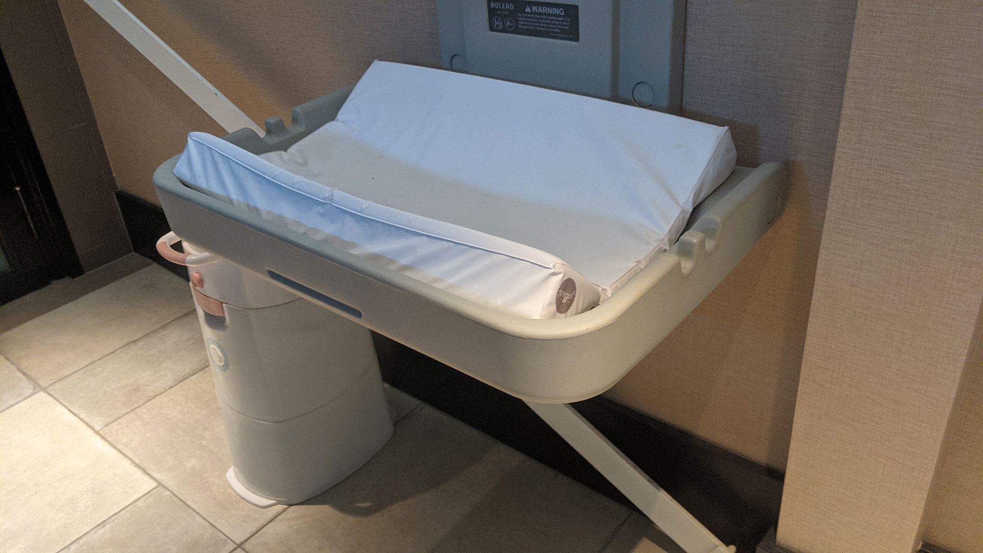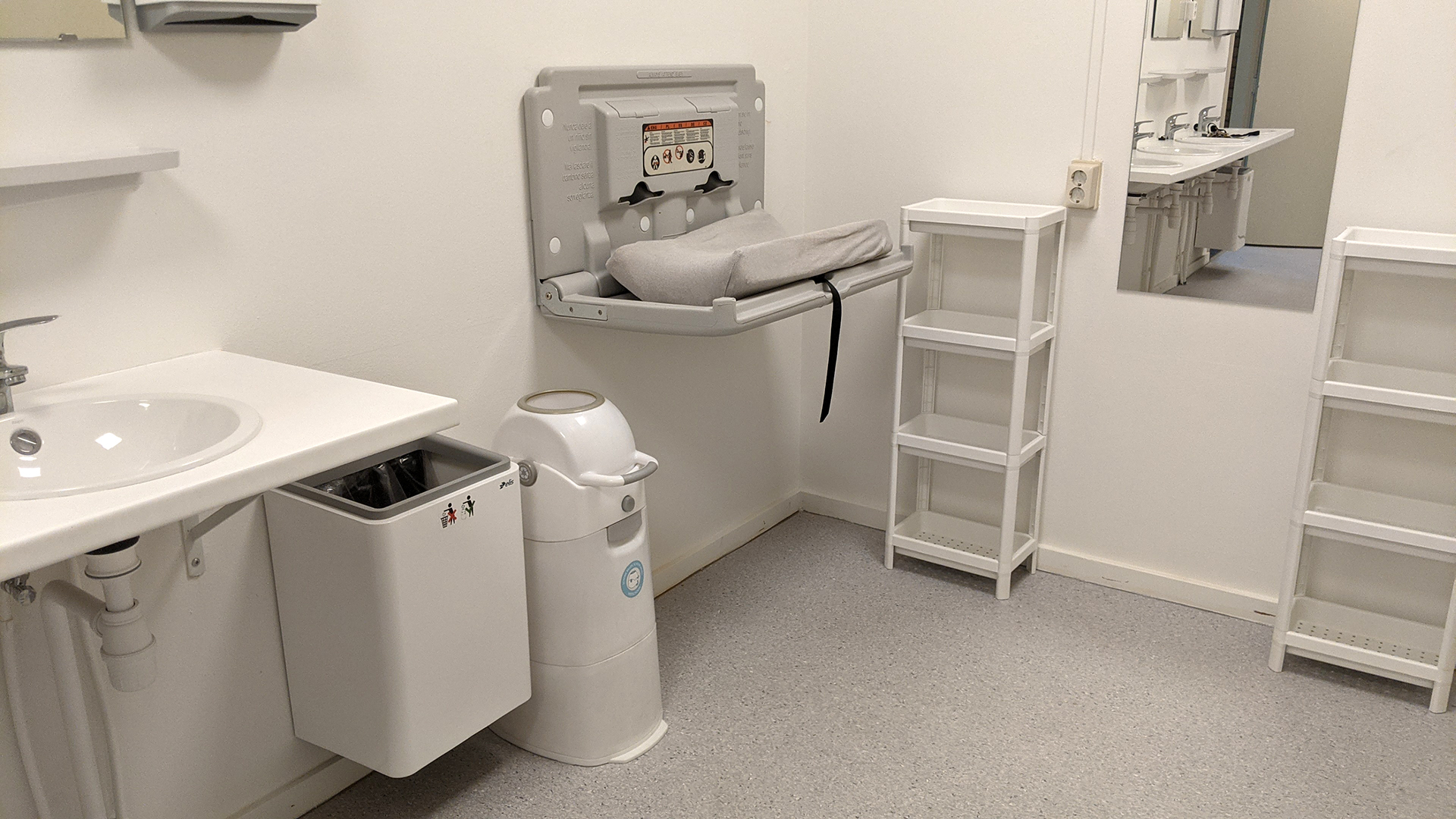 In de toiletten is een uitklapbare commode aanwezig met daarbij een Diaper Champ One Standard luieremmer.