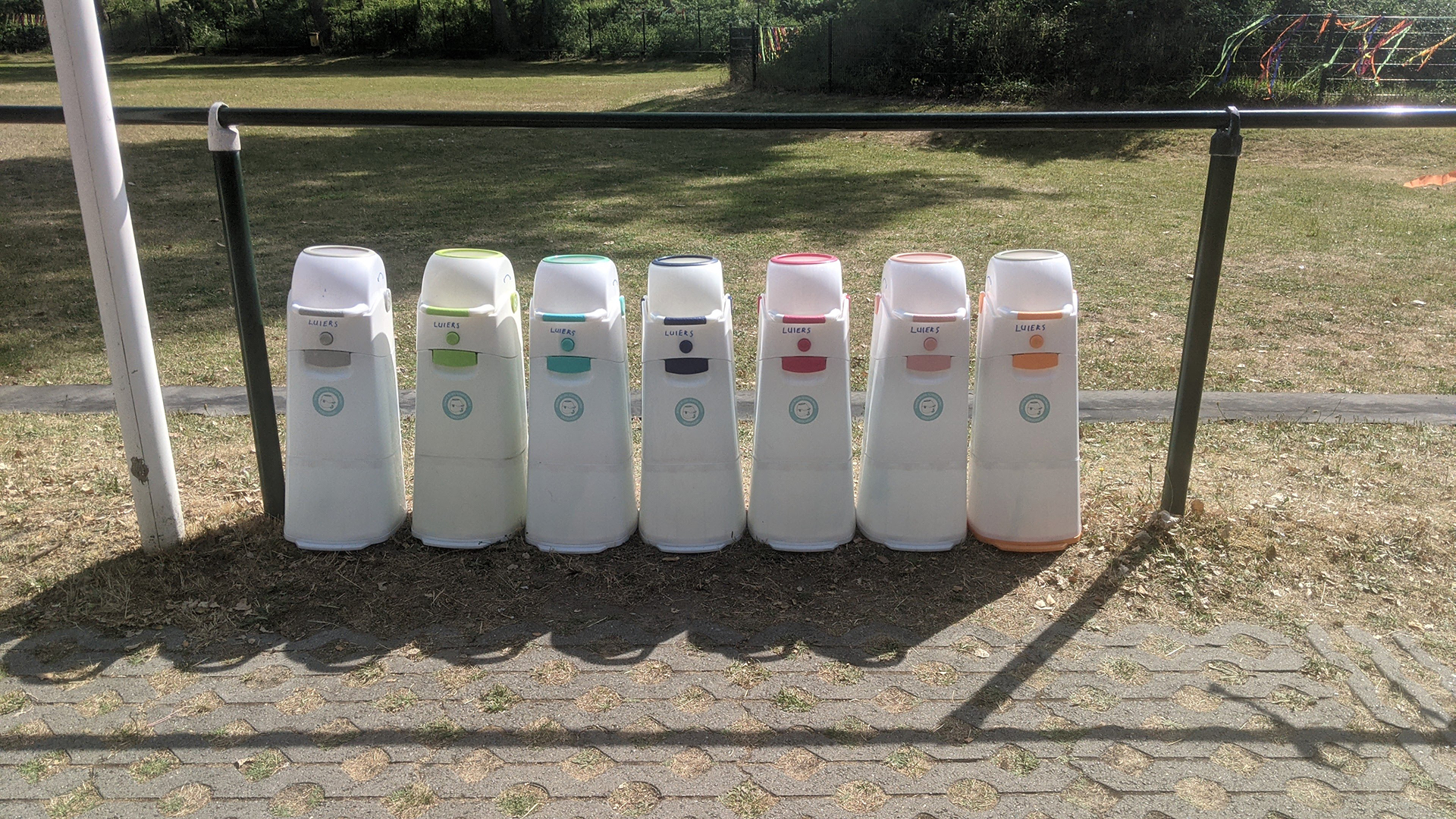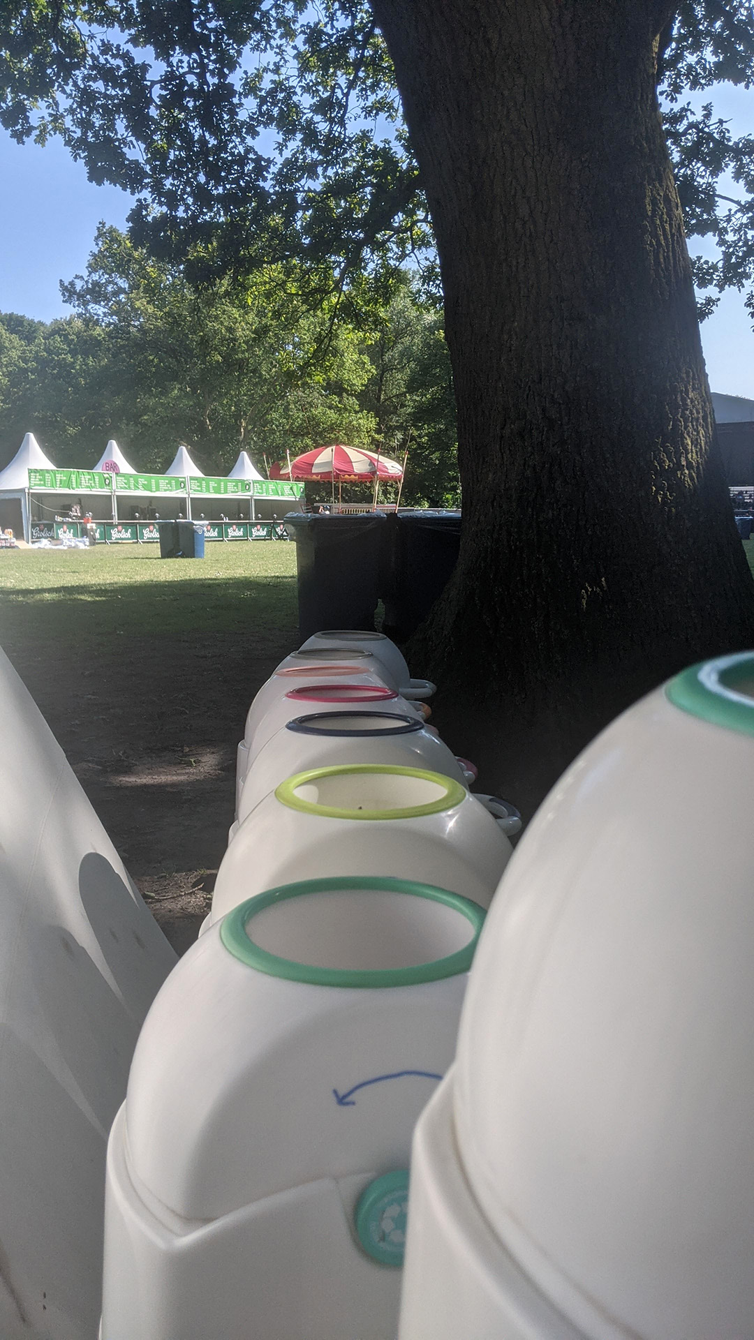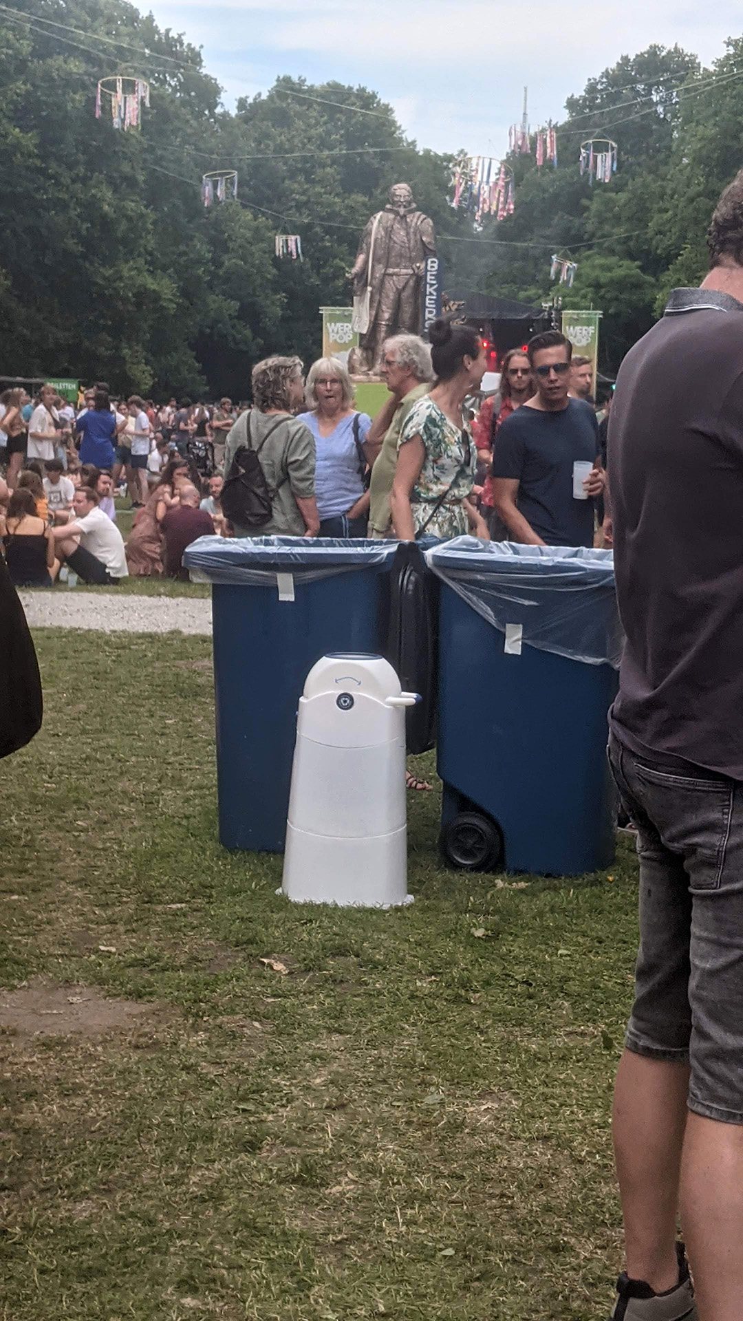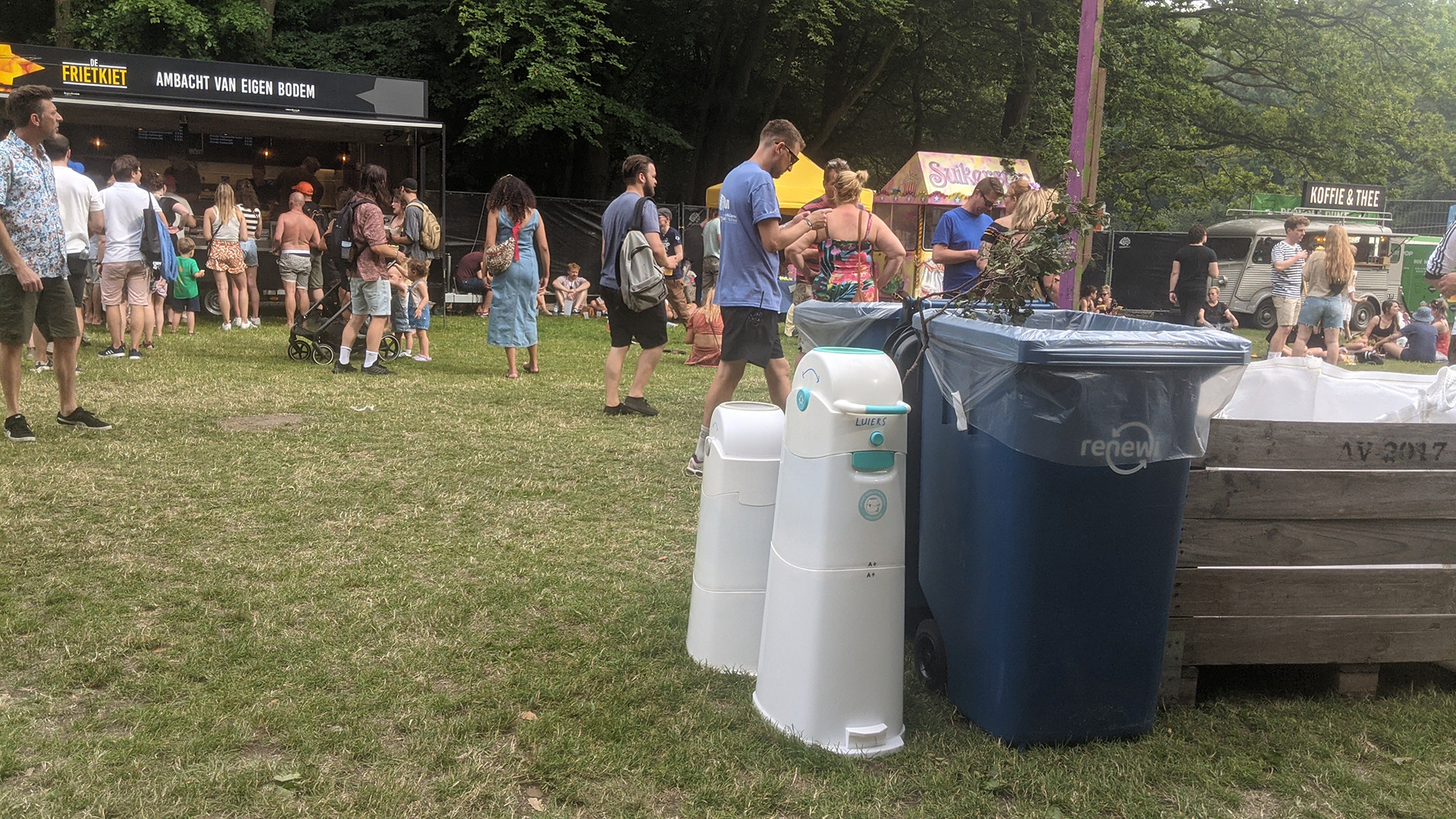 Op het festival staat bij de toiletten een commode met daarbij een DiaperChamp luieremmer en rondom de velden staan nog een aantal DiaperChamp luieremmers.