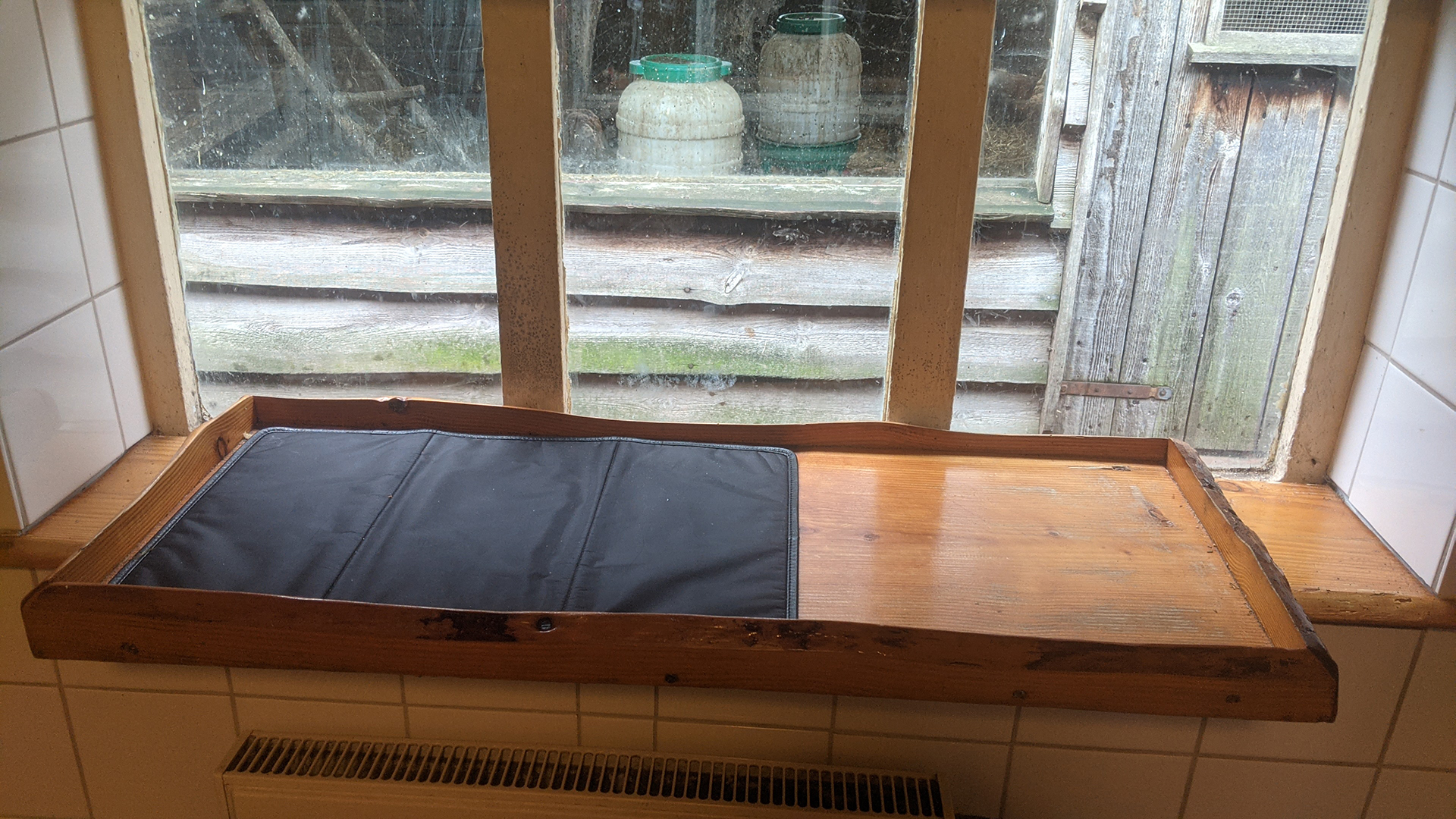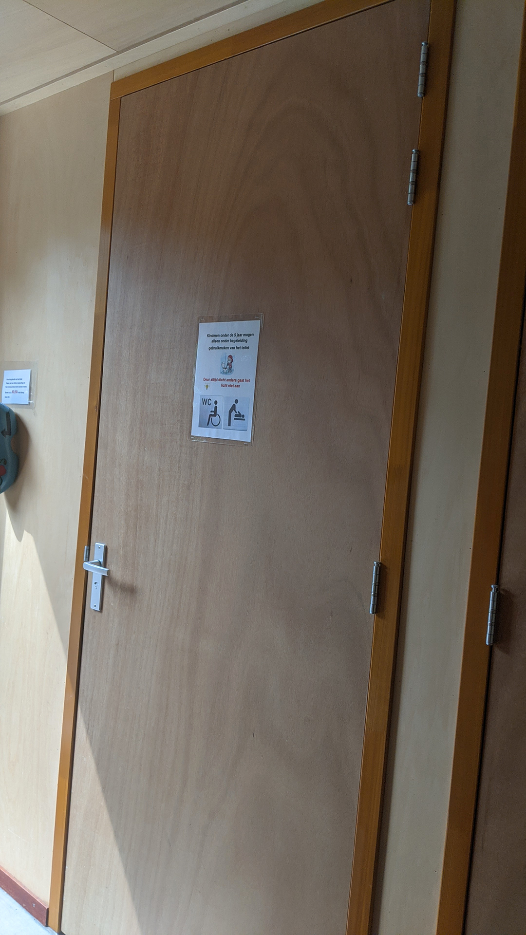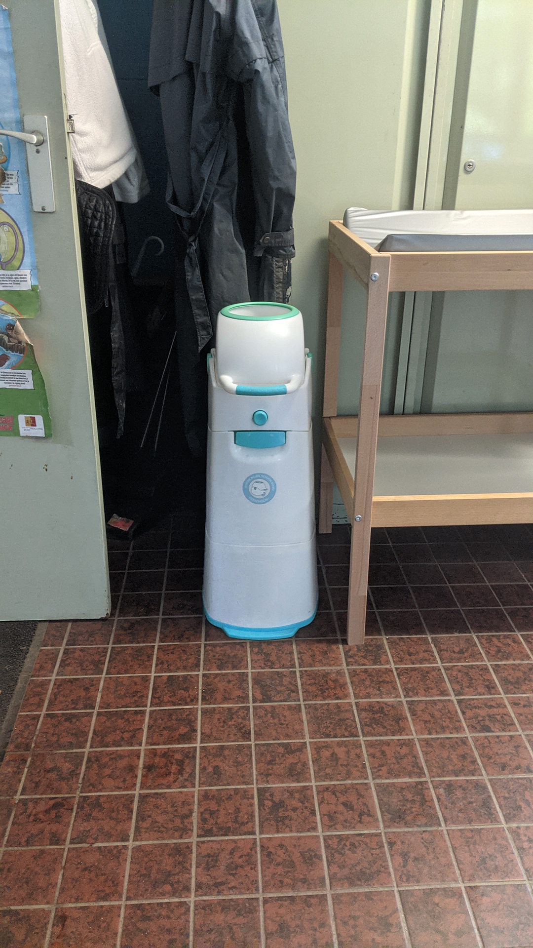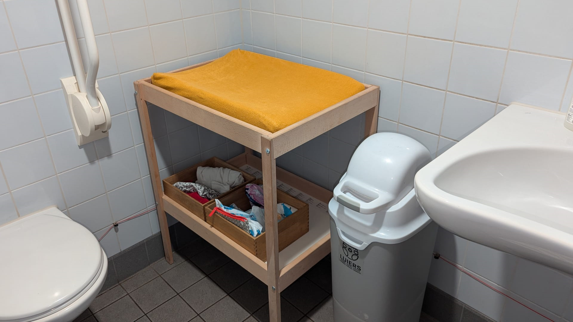 In het mindervalidentoilet is een commode aanwezig met daarop een hoog verschoonkussen en naast de commode een Diaper Champ Classic Large omdat er op drukke dagen grote hoeveelheden luiers worden verschoond.