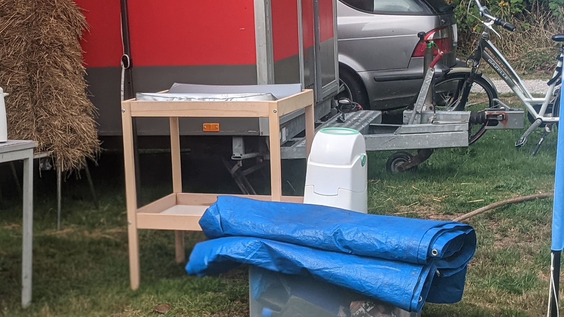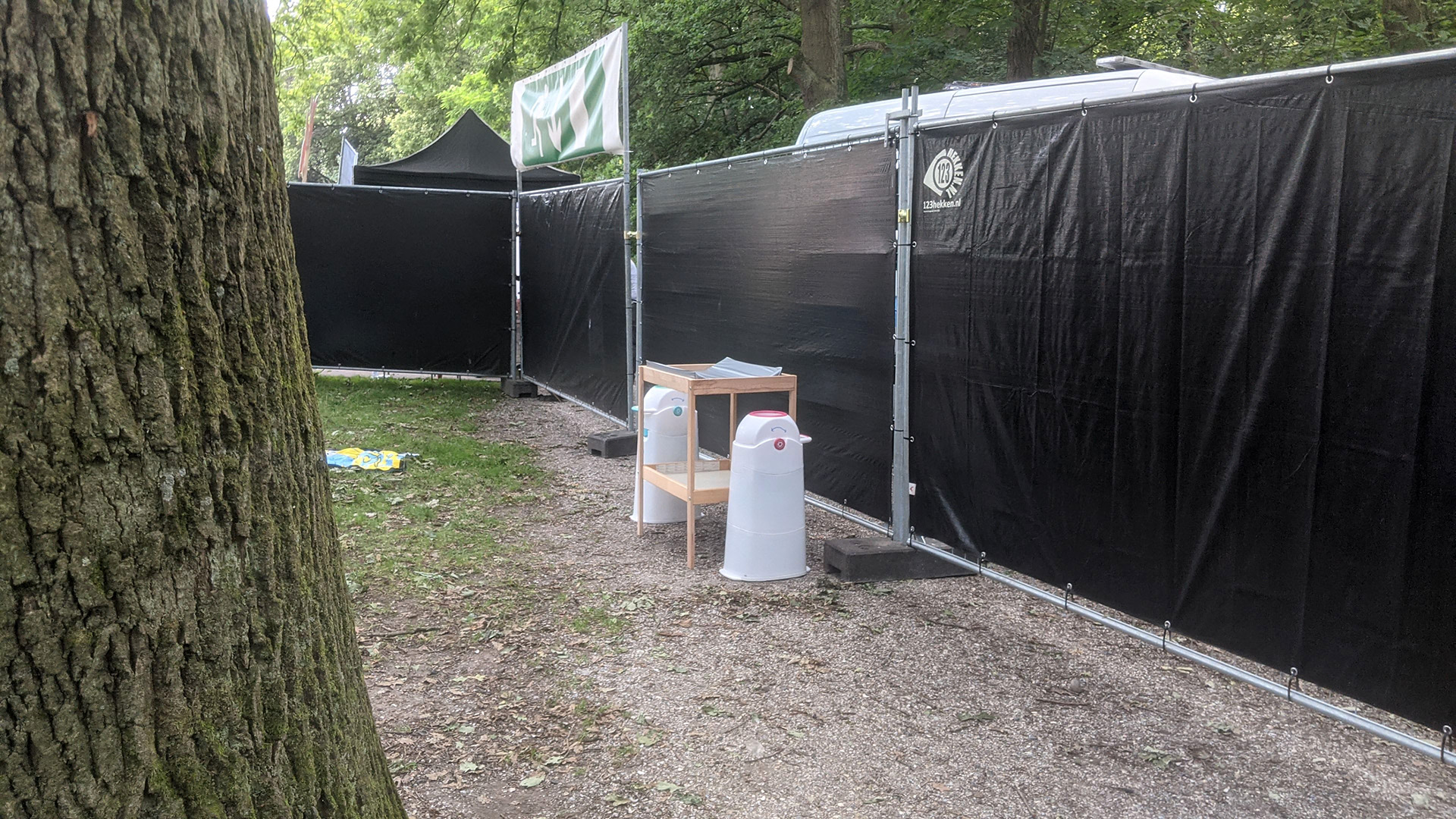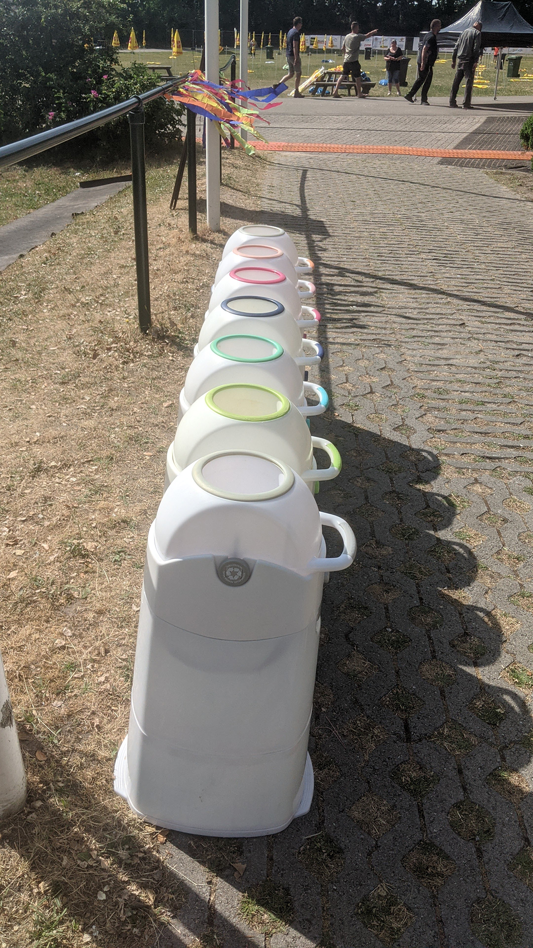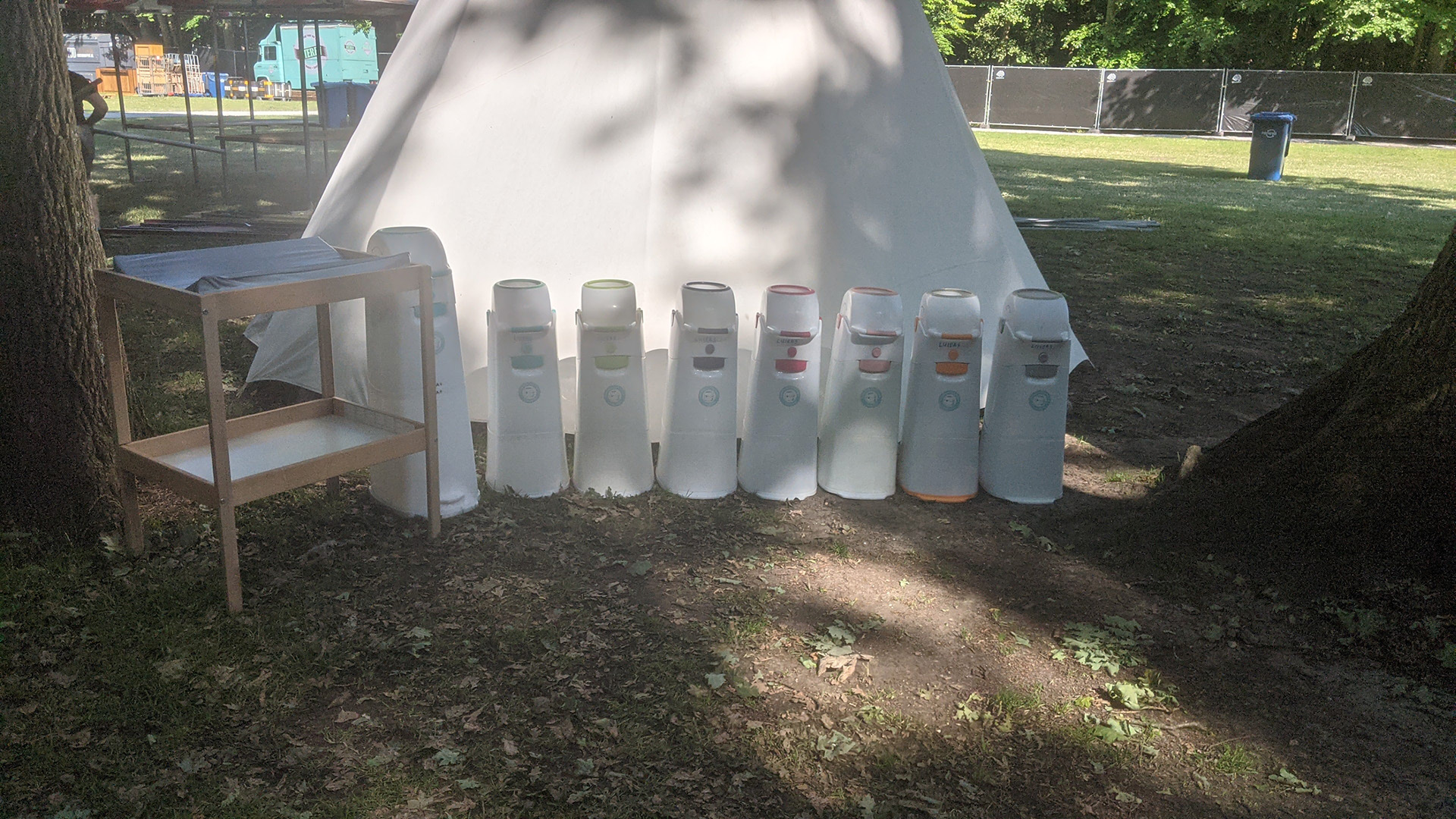 Op het festival staat bij de toiletten een commode met daarbij een DiaperChamp luieremmer en rondom het veld staan nog een aantal DiaperChamp luieremmers.