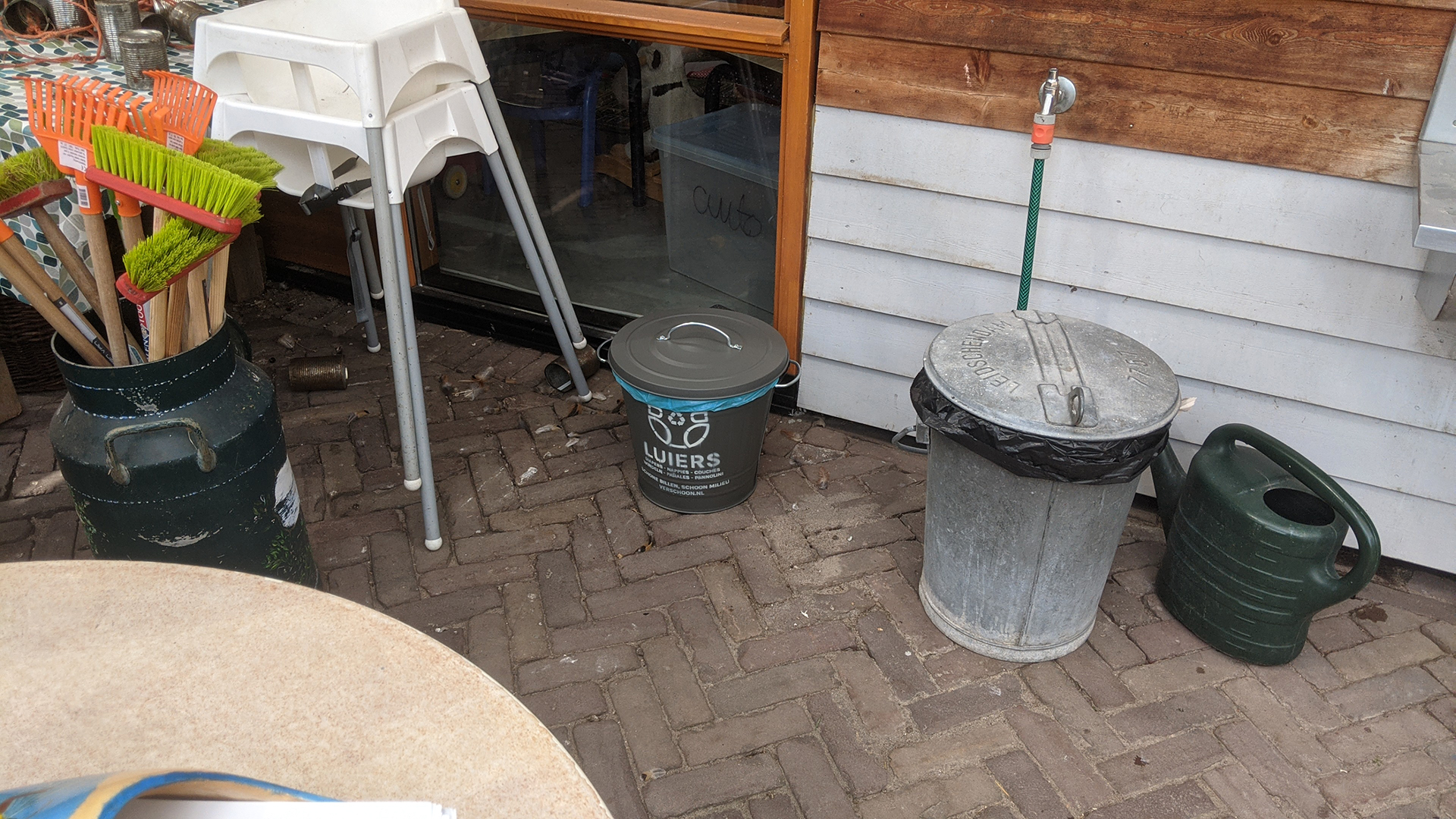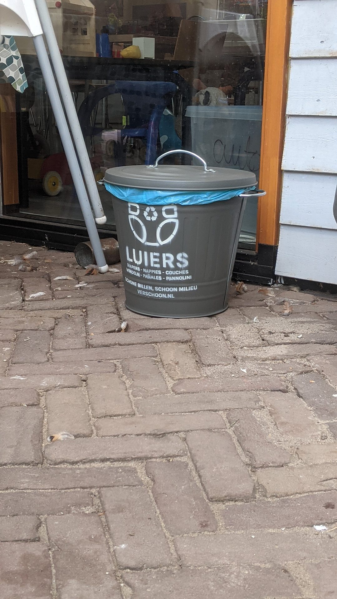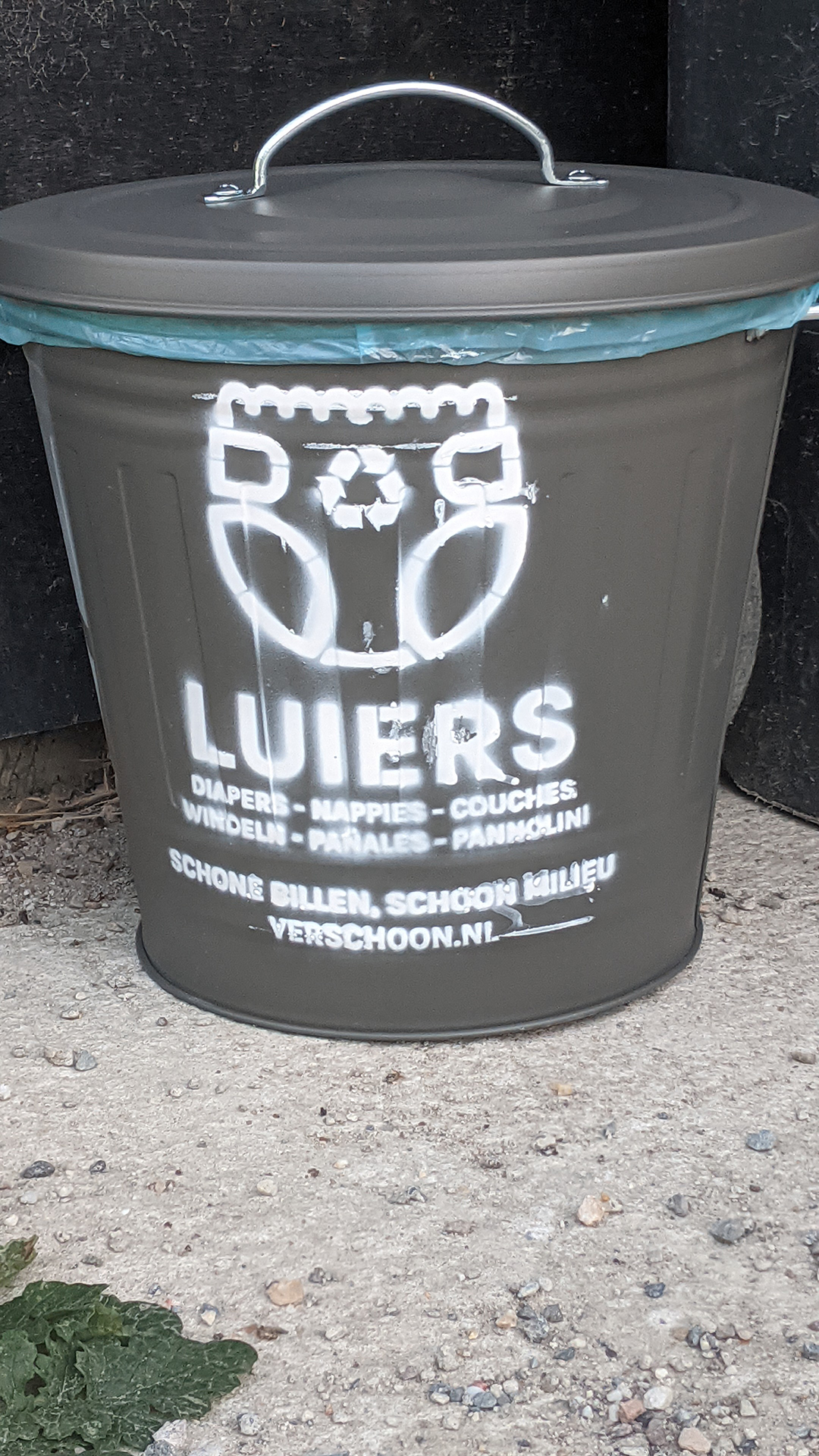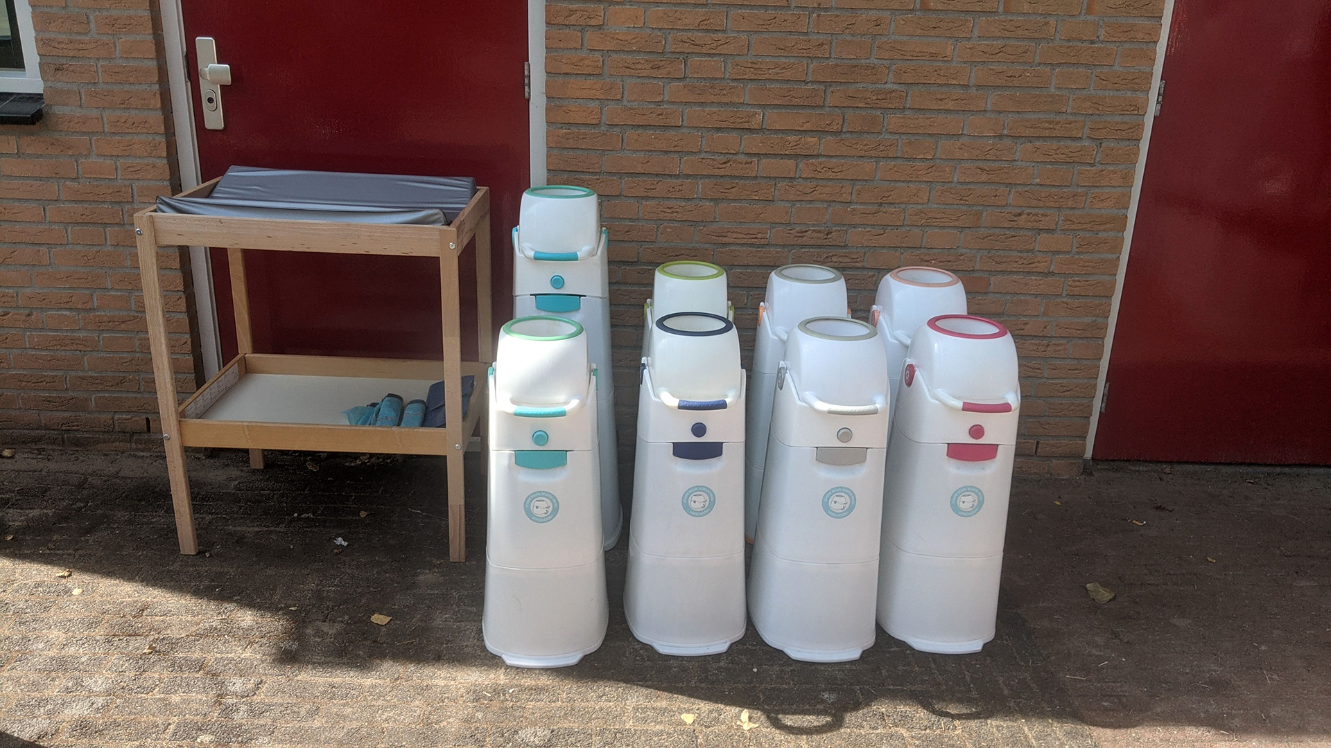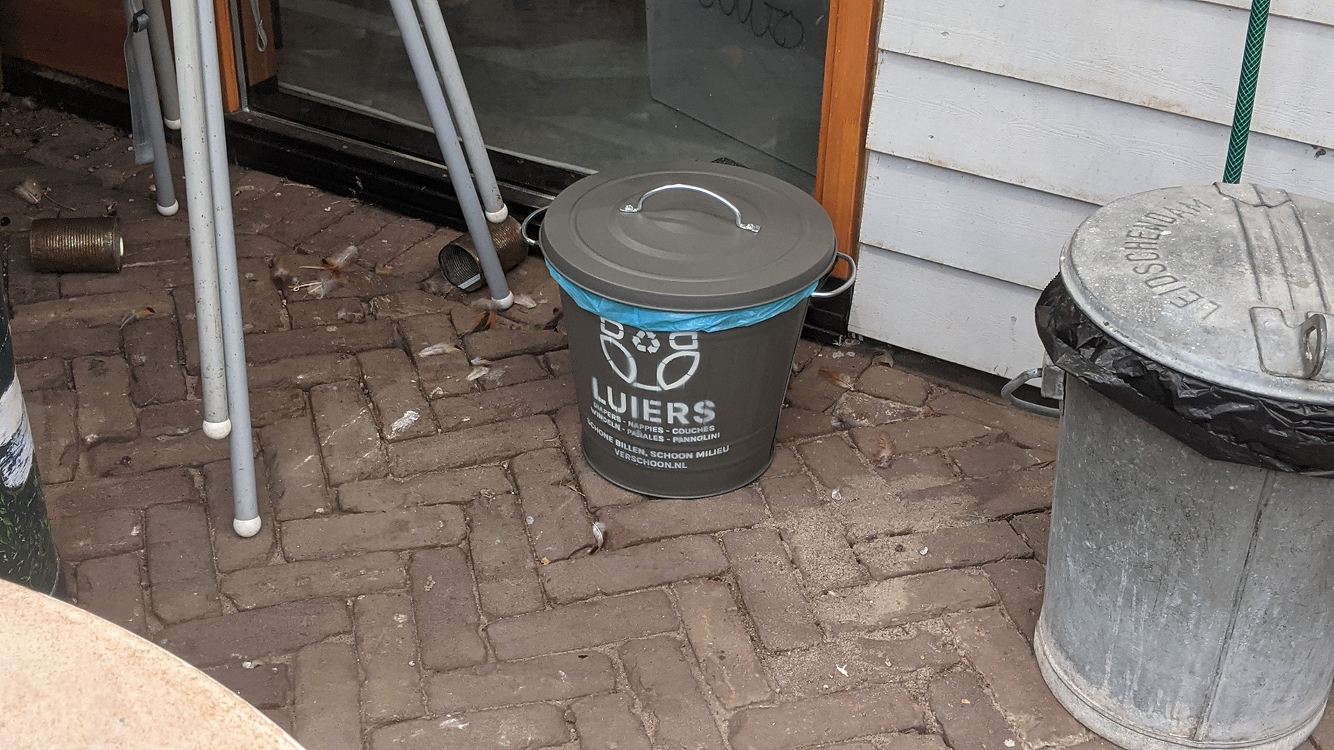 Buiten bij de zandbak en binnen in het mindervalidentoilet staan aparte emmers voor luiers.