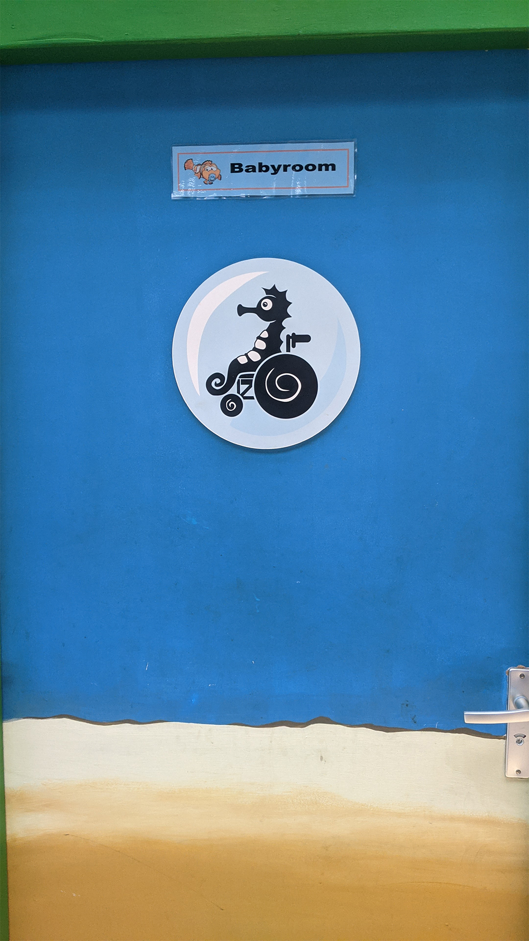 In het gloednieuwe Valk Restaurant "De Kleine Leeuw" staan in zowel(!) het dames- als in het herentoilet commodes met daarbij een Diaper Champ Classic Medium luieremmer. De luieremmers hebben fuchsia (damestoilet) en blauwe (herentoilet) accentkleuren.